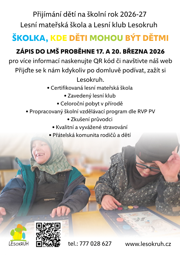 V Lesokruhu věříme, že pravidelný pobyt v přírodě je pro zdravý a všestranný vývoj dětí nenahraditelný. Proto jsme spolu s dalšími rodiči založili spolek, jehož hlavní náplní je provozovat lesní klub (LK Lesokruh), lesní mateřskou školu (LMŠ Lesokruh) a klubík Lesokroužek (pro děti mladší 3 let s rodiči).